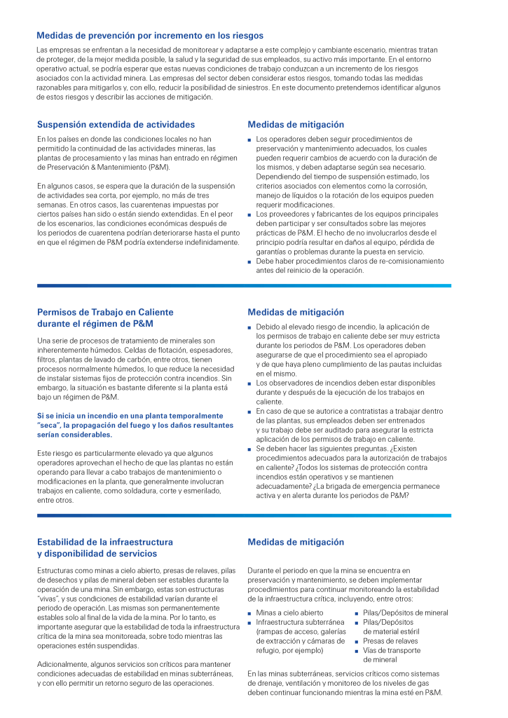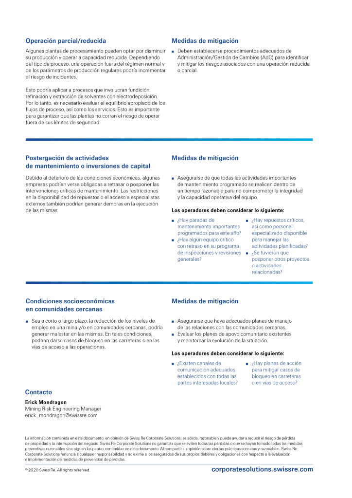 en el sector Minero«, elaborada por los expertos en Risk Engineering Services de Swiss Re Corporate Solutions. En ese sentido, el documento detalla que, el sector minero está siendo afectado por la crisis derivada de COVID-19, y su impacto y consecuencias dependen de diferentes variables, tales como: