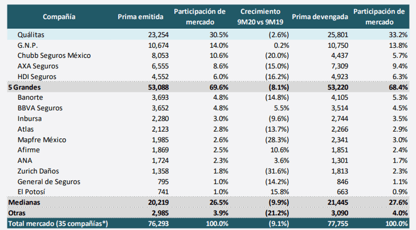El mercado se distribuye en tres categorías: las cinco compañías de mayor tamaño atienden al 69.9%, igual que el trimestre anterior; las medianas tienen el 26.5% de participación, y las pequeñas el 3.9%. Las compañías grandes ganaron 82 pb de participación en comparación con los primeros nueve meses de 2019, mientras que las medianas perdieron 23 pb y las pequeñas 60 pb.