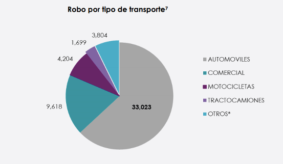 En total, fueron robadas 52 mil 348 unidades: el 63.1% fueron automóviles; el 18.4%, autos comerciales, y el 8%, motocicletas. Este último tipo de transporte presentó el mayor decrecimiento en robo.