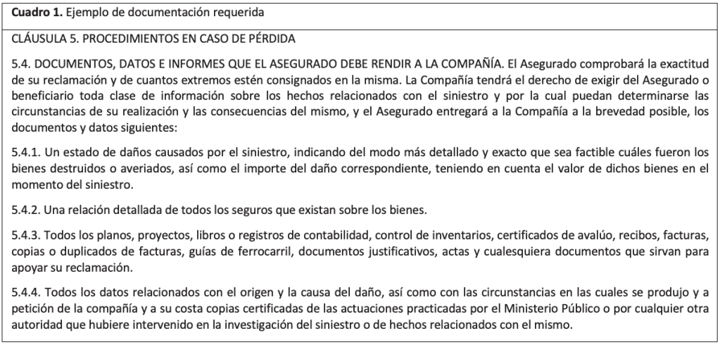 Existen aseguradoras que se concretan a transcribir el artículo 69, pero otras describen el tipo de documentación requerido según el ramo del seguro, como se muestra en el cuadro 1.