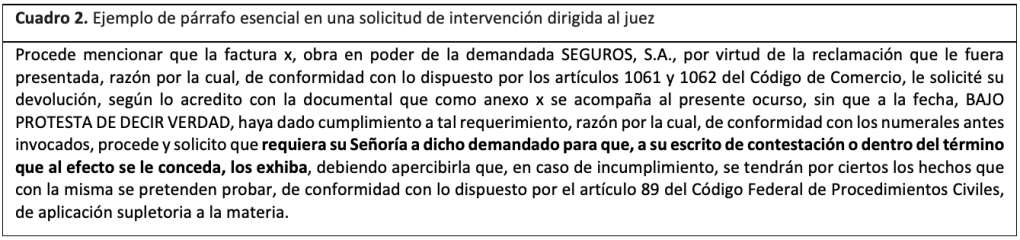 Al solicitar la intervención del juez, es muy importante invocar el artículo 89 del Código Federal de Procedimientos Civiles, que señala: “Cuando una de las partes se oponga a la inspección o reconocimiento ordenados por el tribunal, para conocer sus condiciones físicas o mentales, o no conteste las preguntas que le dirija, deben tenerse por ciertas las afirmaciones de la contraparte, salvo prueba en contrario. Lo mismo se hará́ si una de las partes no exhibe, a la inspección del tribunal, la cosa o documento que tiene en su poder o de que puede disponer”.