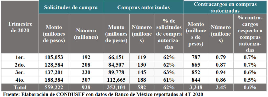 En el 2020 los tarjetahabientes solicitaron la autorización para 938 millones de compras en comercio electrónico, utilizando ambos medios de pago; el 62% finalizó en un movimiento autorizado por parte de la institución emisora de la tarjeta, es decir, 582 millones de operaciones de las cuales solo el 0.6% derivó en un contra-cargo o reclamación por parte del titular de la tarjeta.