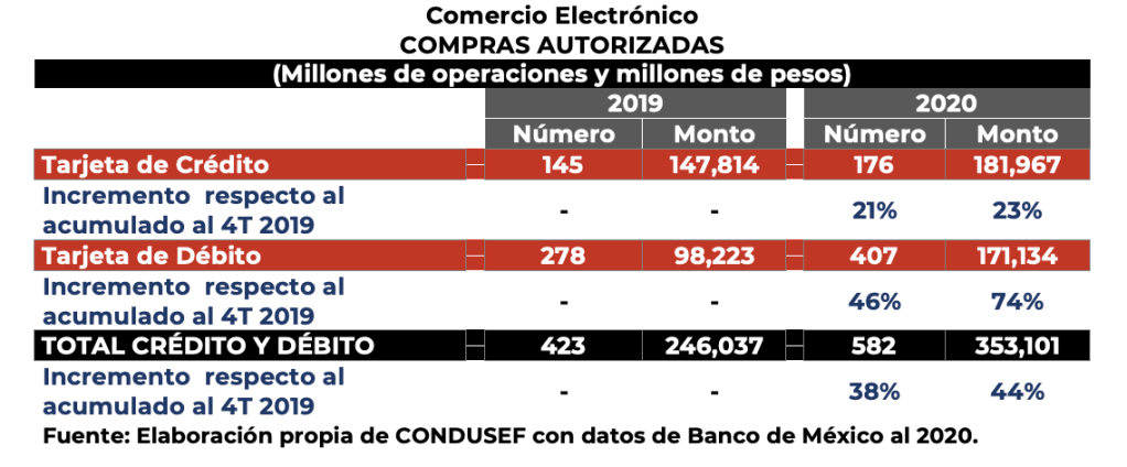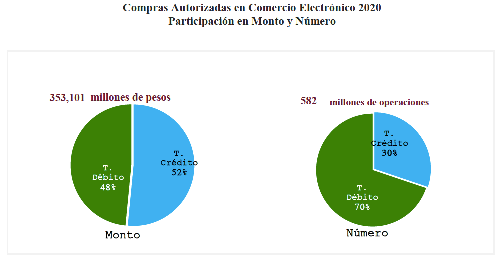 Durante el 2020 se efectuaron alrededor de 3,499 millones de operaciones con las tarjetas de crédito y débito; el 16.6% de estas fueron a través del comercio electrónico, es decir, 582 millones de operaciones. Destaca la tarjeta de débito, cuyas operaciones crecieron un 46% en número de operaciones y en 74% en su monto respecto del 2019; en contraste, las compras con tarjeta de crédito solo aumentaron 21% y 23% en monto, respectivamente.