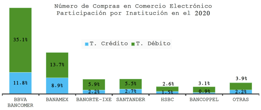 En 2020 fueron dos instituciones las predominantes en las operaciones en comercio electrónico (582 millones) tanto para la tarjeta de crédito como de débito: BBVA Bancomer con el 46.9% y Banamex con el 22.6%.