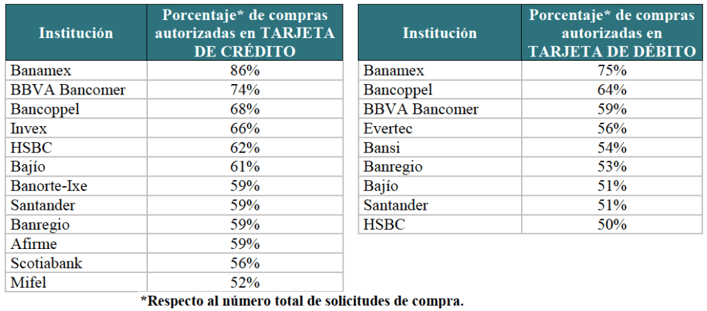 En términos generales el porcentaje de autorización de las compras por internet en el 2020 fue de 62%; en la tarjeta de crédito se autorizaron 7 de cada 10 compras mientras que con una tarjeta de débito se concretaron 6 de cada 10, esto en virtud de que las instituciones evalúan muchas veces la seguridad de los sitios de compra, el tiempo y monto de las operaciones, o bien si existe el saldo suficiente para materializarlas.