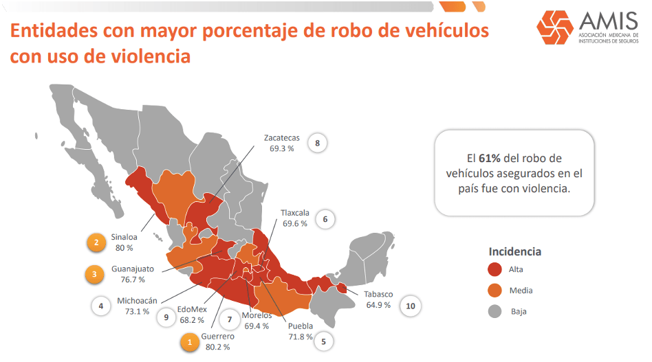 - 7 de cada 10 unidades aseguradas se roban en solo 6 estados, (Edomex, Jalisco, CDMX, Guanajuato, Puebla y Veracruz)