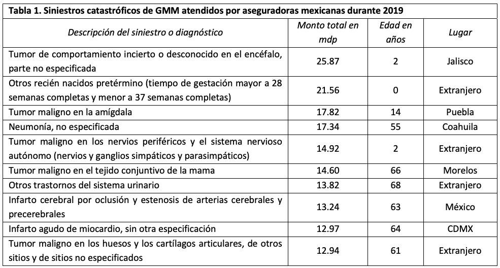 ¿Sabías que las compañías que operan seguros de gastos médicos mayores en México cubrieron a más de 11 millones de personas en 2019? Esta cantidad representa el 9% de la población del país y significó un desembolso de más de 55 mil millones de pesos. La AMIS reporta que ese año se atendieron varios padecimientos únicos y sumamente severos (ver tabla 1).