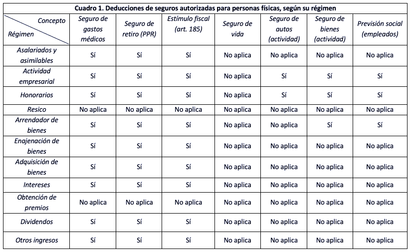 En el cuadro 1 te presento un resumen de qué primas (seguros) pueden deducir las personas físicas, según el régimen en el que tributen, de acuerdo con la Ley del ISR.