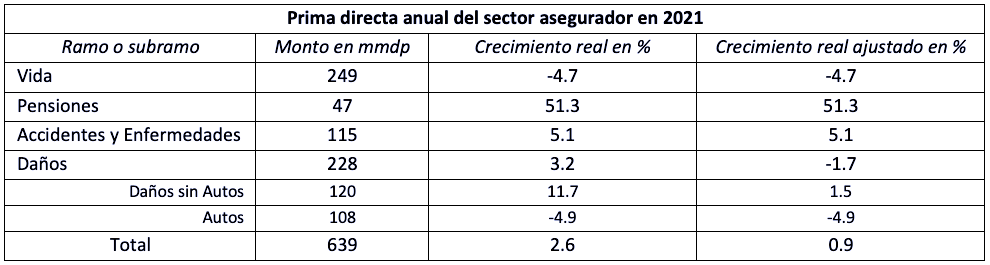 El monto de las primas directas de seguros y fianzas ascendió a 650.5 mmdp en 2021, lo que representa un crecimiento real del 2.6% y un crecimiento real ajustado del 0.9%, pero en el cuarto trimestre, al igual que en el tercero, la prima cayó un 3.8%. Al decrecimiento trimestral contribuyeron las caídas de Vida (6.9%), Pensiones (5.5%), Daños (0.06%) y Fianzas (7.1%).