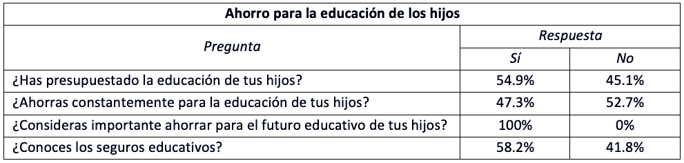 Nuestra encuesta reveló que todos se preocupan por el futuro educativo de sus hijos, pero solo un 47.3% de las personas ahorra de manera constante para garantizarlo. Dado que los tiempos de enorme incertidumbre, como los actuales, nos impulsan a prever todavía más el futuro y a apoyarnos en todas las herramientas funcionales para mantener nuestra estabilidad económica y financiera en los momentos más críticos, el conocer y utilizar los seguros educativos ya no es una opción, sino una necesidad apremiante.