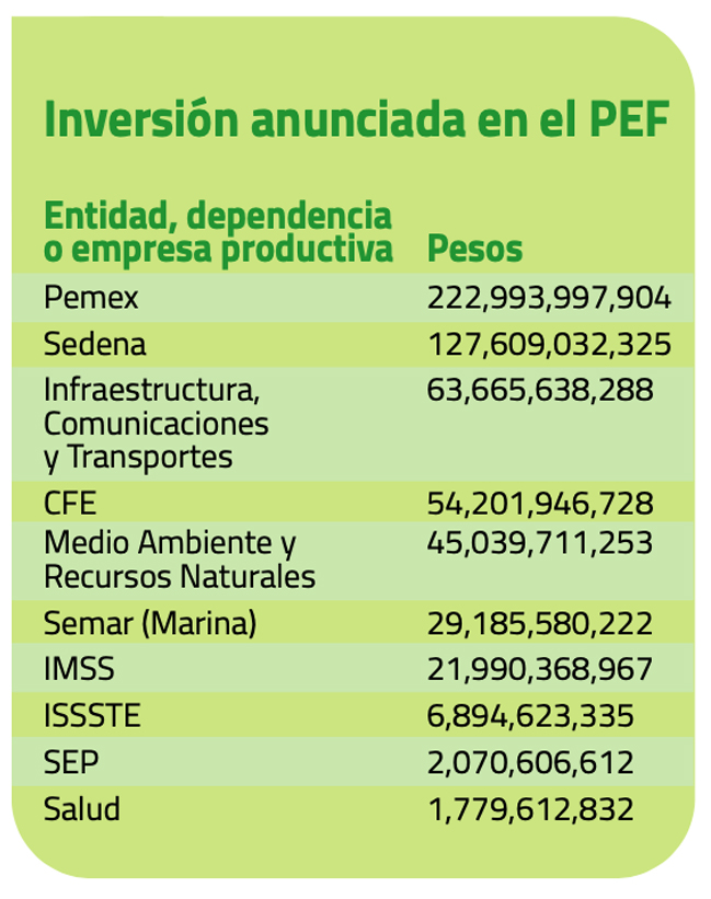 En la tabla se muestran los principales rubros de inversión anunciados en el PEF que resultan de interés para el sector. Muchos de ellos están destinados a la consecución de los grandes proyectos y a los aspectos que les son inherentes para su debido establecimiento y operación.