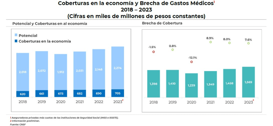 La colaboración pública y privada en los seguros de gastos médicos es fundamental. La brecha de cobertura para Gastos Médicos fue de 3.2 veces en 2023, mientras que en 2022 fue de 3.1. La brecha para mujeres fue de 3.3 veces; la de hombres, de 3.1.