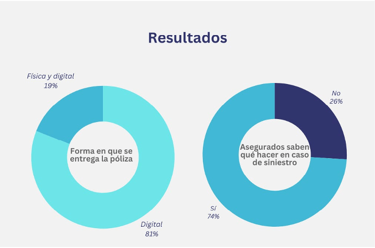 En las gráficas presentamos los resultados obtenidos a través de la encuesta. Para nuestra sorpresa, el 81% de los agentes entrega los documentos y las pólizas de manera digital, mientras que solo el 19% los entregan de forma física y digital, y el 26% de los asegurados no sabe qué hacer en caso de un siniestro, mientras que el 74% restante sí conoce qué acciones tomar.