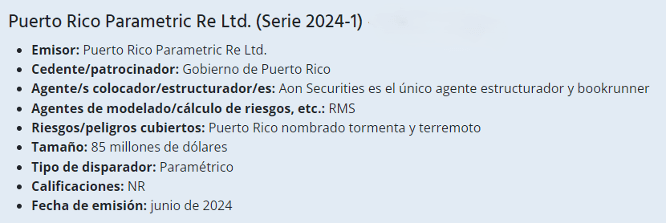 Parametric Re Ltd.,pues se otorgaron 85 mdd de protección de seguro paramétrico contra desastres a Puerto Rico, lo que confirma que en Latinoamérica es posible alcanzar una suma asegurada de 100 mdd (ver imagen 1).