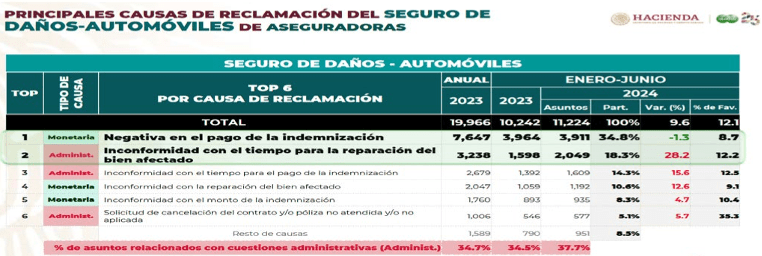 De esos posibles 36 mil asuntos, un 60% corresponde a Autos, lo cual se debe a diversos factores externos que provocaron el desabastecimiento de autopartes, reforzaron la idea de que el seguro no paga y dañaron la reputación de las compañías que operan los productos de este ramo. En la tabla 1, se observan las principales causas de reclamación de los usuarios de pólizas de autos.