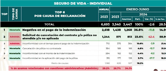 Del mismo universo de asuntos en contra de las aseguradoras, un 25% corresponde a Vida, menos del 10% a Gastos Médicos y el resto a otros tipos de seguros. En la tabla 2 se muestran las principales causas de reclamación de los usuarios de pólizas de vida individual. Ambas tablas son parte de la ficha estadística de reclamaciones y diversos indicadores que Óscar nos compartió.