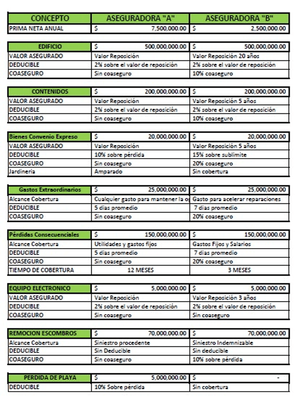 “En Cancún presentamos el ejemplo real de un hotel que pagaba una prima de 7.5 millones de pesos y de uno que pagaba una prima de 2.5 millones, para mostrar a los agentes la ventaja de la póliza que era tres veces más cara. El asegurado cobró 200 millones más de perdida por pagar 5 millones más de prima cada año, así que a la hora del siniestro recibió bastante más dinero que el asegurado que pagó menos prima”, comentó Alfredo. Por eso, al buscar una cobertura se recomienda analizar cuál otorgará una mejor indemnización. (ver tabla)