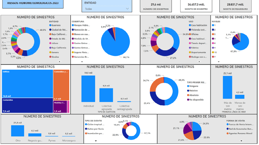 Del total de siniestros a nivel nacional, Guerrero tuvo la mayor participación con el 82.8%, lo cual se debe principalmente a los daños ocasionados por Otis. La cobertura más afectada fue la de riesgos hidrometeorológicos con el 95.1% del monto de los siniestros. La casa habitación fue la más afectada con el 21.2%, seguida del hotel con el 18.1%, las oficinas con el 12.9%, los departamentos con el 12.9% y las tiendas departamentaes con el 10%. Las construcciones más afectadas fueron de un nivel (primer piso o planta baja) con el 41.3% y de un segundo nivel (segundo piso) con el 15.6%. Por los vientos del huracán, las estructuras de los edificios fueron las más afectadas con 19,796.8 millones de pesos, seguidas por los contenidos con 14,520.7 millones de pesos. Las pólizas individuales fueron las más afectadas con un importe de 24 mil millones de pesos y las colectivas agrupadas fueron impactadas con 11 mil millones de pesos. De las pólizas, el 52.7% no era a primer riesgo, el 29.8% era a primer riesgo relativo y el 16.2% era a primer riesgo absoluto.