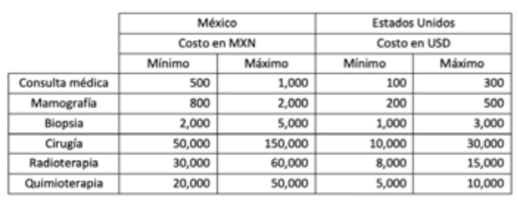 El tratamiento para este cáncer depende del estado y tipo del tumor. Los tratamientos más comunes son la cirugía (mastectomía o lumpectomía), la radioterapia, la quimioterapia, la terapia hormonal, la terapia dirigida y la inmunoterapia. Los tratamientos novedosos están en constante evolución. Algunos enfoques prometedores incluyen medicamentos que atacan específicamente las células cancerosas y otros utilizan pruebas multigenéticas para guiar el tratamiento y predecir la probabilidad de recurrencia. Los costos de esta enfermedad varían según el país y el tratamiento. En la tabla, se presenta una estimación aproximada de los costos en México y Estados Unidos.