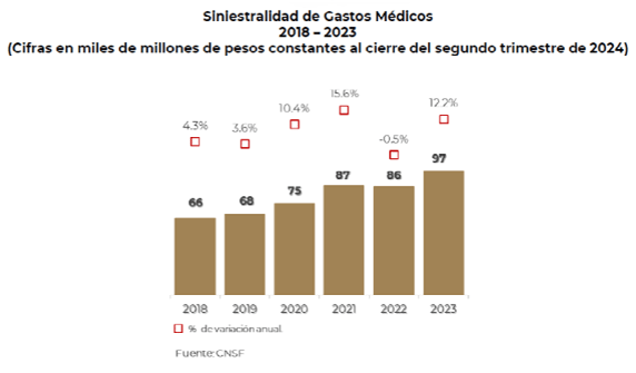 A pesar de los incrementos reflejados en el precio, el número de siniestros mostró una recuperación de 2.2 puntos porcentuales (p. p.) al cierre de 2023, lo cual, aunado a la inflación del sector, ha impulsado el aumento de las primas y de los costos de los servicios de salud.