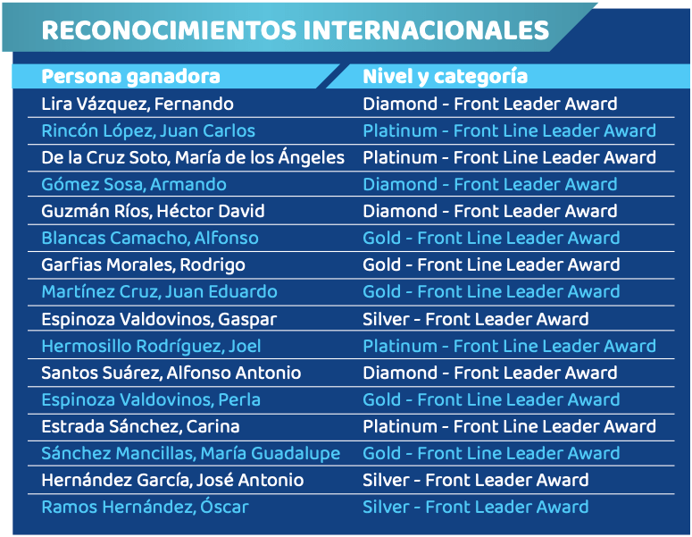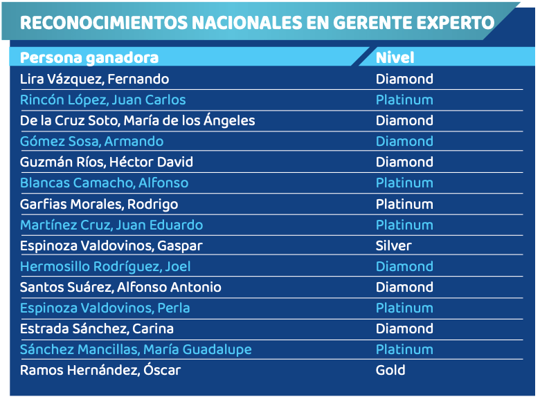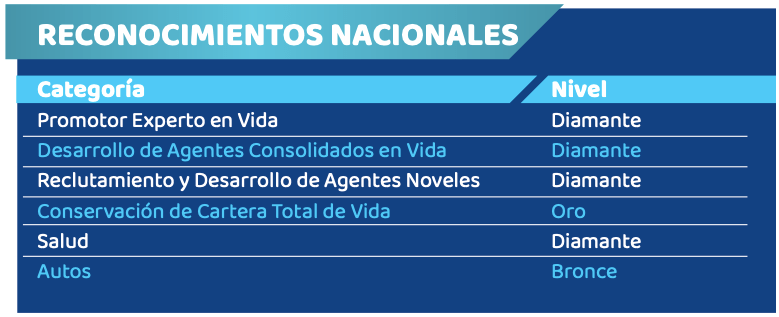 En la cena de gala del congreso, Grupo KC también obtuvo reconocimientos nacionales de nivel diamante, platino, oro, plata y bronce en las categorías Promotor Experto en Vida; Desarrollo de Agentes Consolidados en Vida; Reclutamiento y Desarrollo de Agentes Noveles; Conservación de Cartera Total de Vida; Salud; Autos, y Gerente Experto.