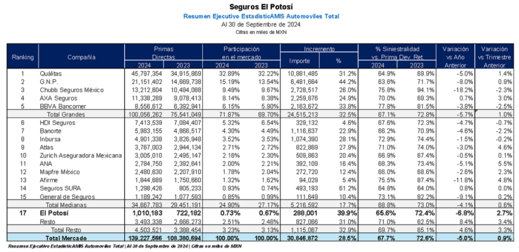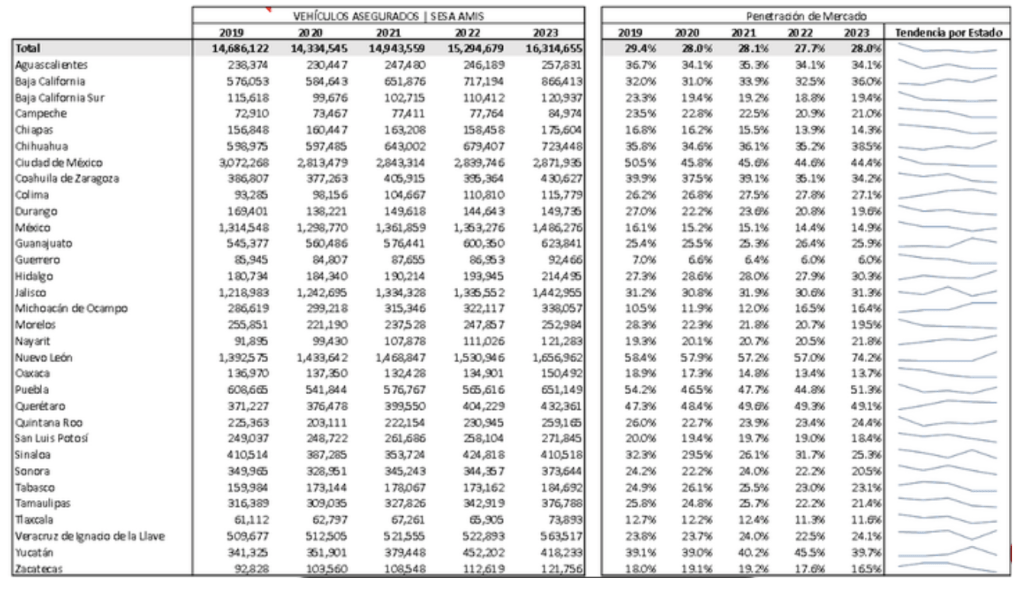 El parque vehicular asegurado se concentra sobre todo en cinco de los siete estados con mayor volumen de unidades en circulación: Ciudad de México con 2.9 millones (m.) de unidades protegidas de las 6.5 m. que circulan en su territorio; Nuevo León con 1.6 m. de 2.2 m.; Estado de México con 1.5 m. de 10 m.; Jalisco con 1.4 m. de 4.6 m., y Baja California con 0.8 m. de 2.4 m. Estas cinco entidades junto con Guanajuato y Veracruz abarcan el 52% de los 58 m. de vehículos que circulan en el país. Solo el 28% del parque vehicular de México está asegurado. Aunque el número de vehículos asegurados hasta 2023 (16 millones 314 mil 655) supera al correspondiente al cierre de 2019 (14 millones 686 mil 122), la penetración del mercado es inferior, pues en 2019 fue del 29.4% y en 2023 fue del 28%. Pese a ello, el mercado en 2024 muestra señales de recuperación al 30 de septiembre respecto a 2023 en primas (28.5%) y siniestralidad (-5%), pero las tendencias mantienen la inercia del alza en los precios.