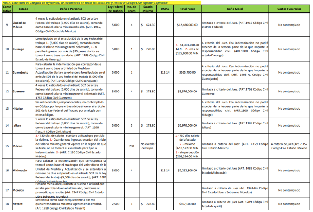 Por ejemplo, en la Ciudad de México, el cálculo de la indemnización por el fallecimiento de una persona toma como base el cuádruple del salario mínimo más alto (art. 1915 del Código Civil de la Ciudad de México), cantidad que se multiplica por 5000 como indica el artículo 502 de la Ley Federal del Trabajo (LFT). En cambio, el Código Civil de Zacatecas toma como base la Unidad de Medida y Actualización (UMA) diaria, cantidad que se multiplica por los 5000 días de salario establecidos en el artículo 502 de la LFT.