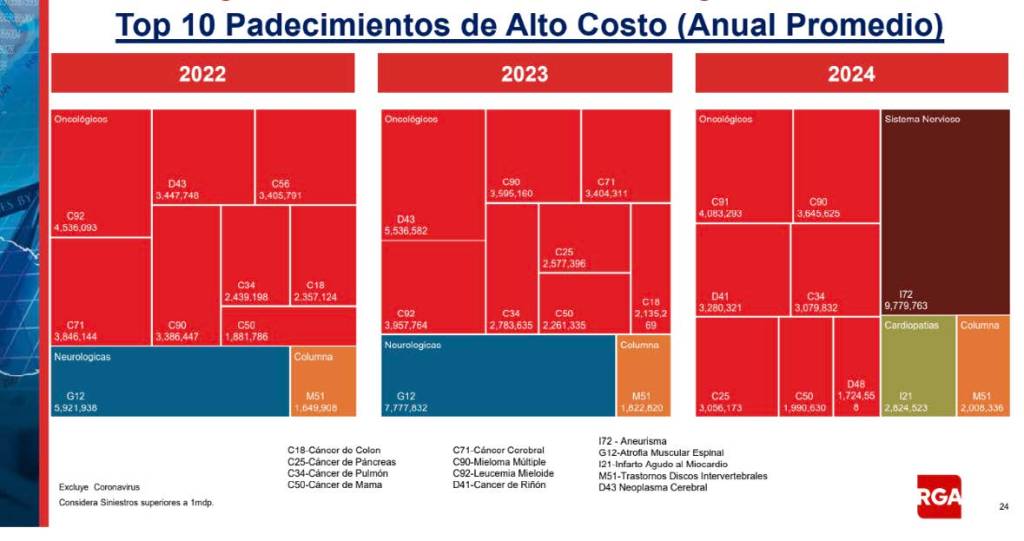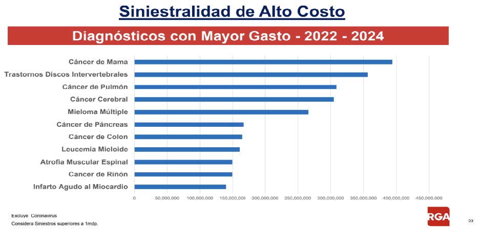 El experto explicó que el encarecimiento de los seguros médicos es ampliamente discutido sobre todo por los elevados gastos asociados con las enfermedades graves, crónicas o degenerativas, pues estas representan un alto riesgo financiero para los pacientes y las aseguradoras porque los tratamientos son prolongados y requieren tanto el uso de tecnología médica avanzada como una atención especializada. Debido a ello, los seguros médicos que cubren este tipo de padecimientos tienden a tener primas más altas y condiciones más estrictas. Factores como la inflación médica, el envejecimiento de la población y la creciente frecuencia de estas enfermedades han impulsado el aumento del precio de las pólizas. En la gráfica 1 se muestran los padecimientos cuya siniestralidad tuvo un mayor impacto en el costo de los seguros médicos de 2022 a 2024. Entre estos males, el cáncer de mama ocupó el primer puesto por la complejidad y duración del tratamiento, ya que este combina cirugías, quimioterapias, radioterapias y medicamentos caros, los cuales elevan de forma significativa el gasto médico y la siniestralidad de esta enfermedad. El costo de un caso de cáncer de mama depende de la etapa en que se detecte el padecimiento y de tanto el tipo como la duración del tratamiento, pero puede ascender a alrededor de 400 mil pesos. En la gráfica 2 se ve cómo, en el top 10 de los padecimientos con mayor costo entre 2022 y 2024, las enfermedades oncológicas superan a las otras.