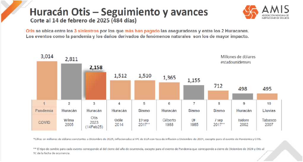 La industria aseguradora mexicana ha calculado 39 mil 460 millones de pesos en daños ocasionados por Otis principalmente a viviendas. Las aseguradoras han pagado el 91% del monto siniestrado en viviendas y el 80% de los daños estimados (6189 millones de pesos) en hoteles o servicios de hospedaje.