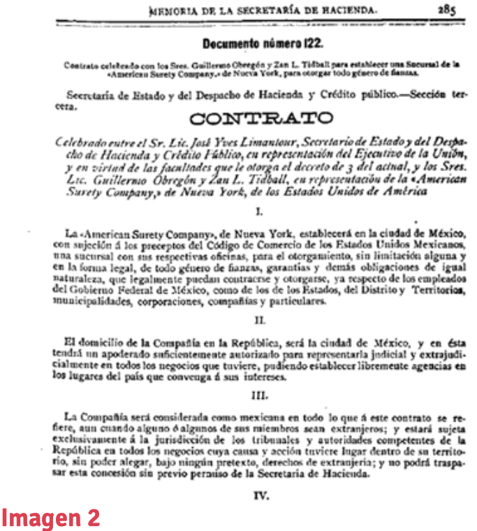 El 15 de junio del mismo año, en la Ciudad de México, se prepararon dos ejemplares timbrados del Contrato celebrado con los Sres. Guillermo Obregón y Zan. L. Tidball para establecer una sucursal de la “American Surety Company” de Nueva York, para otorgar todo género de fianzas, el cual fue firmado por las partes el 19 de junio de 1895 (ver imagen 2).