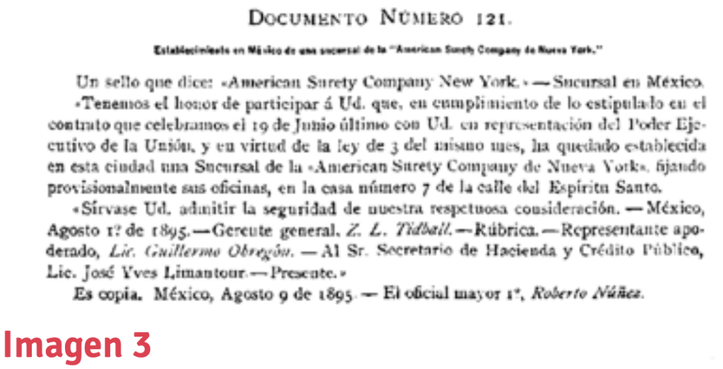 Entre otras cosas, se estableció que dicho contrato tendría una vigencia de 15 años, durante los cuales la compañía: estaría exenta de toda clase de impuestos y contribuciones; podría retirar su fianza con aviso previo a la Secretaría de Hacienda; se subrogaría en los derechos y acciones del fisco o del acreedor para obtener el reembolso; podría ejercitar sus derechos contra coautores o cómplices del empleado responsable, y cobraría un mínimo de 25 pesos por fianza de funcionarios y empleados federales, monto que se denominaba “premio” y que variaba de acuerdo con la tarifa establecida en el propio contrato, pues a mayor importe a garantizar mayor premio –¿qué curioso no?–. Tras la firma de este contrato, finalmente se estableció la sucursal en México (ver imagen 3).