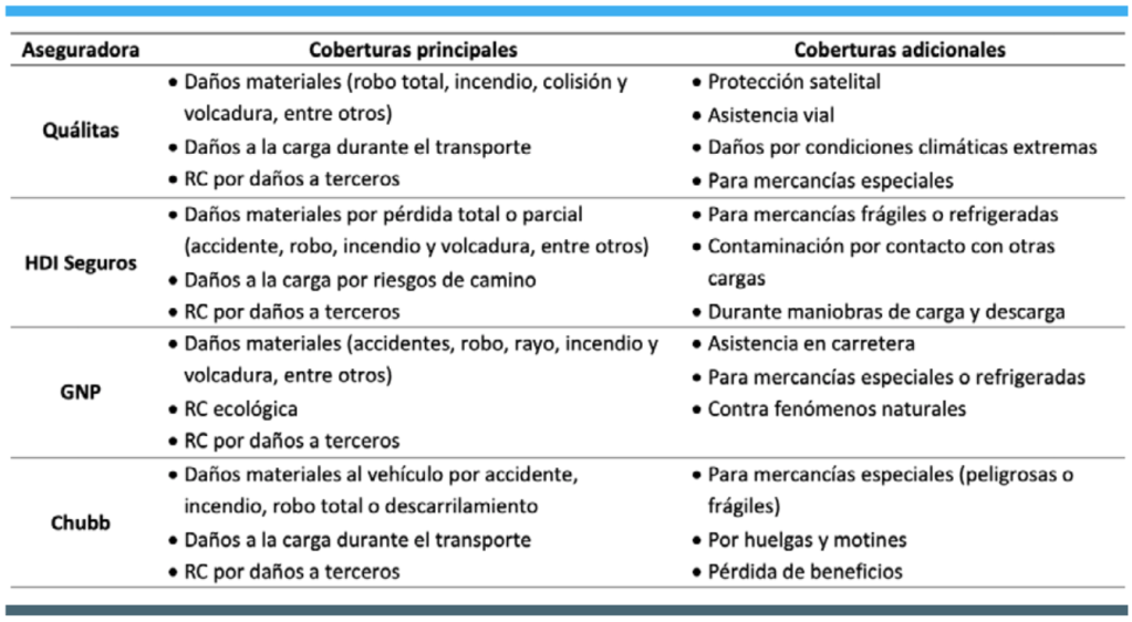 Por ello, para el transporte pesado cobra especial relevancia la cobertura de responsabilidad civil (RC) por daños a terceros, la cual es indispensable para proteger a los operadores y las empresas ante los perjuicios causados a los otros vehículos, las infraestructuras, los peatones, las mercancías ajenas y el medioambiente (cuerpos de agua o áreas naturales, por ejemplo) mientras se usa un vehículo pesado. En el cuadro te presentamos cuatro compañías que ofrecen esta protección y pueden ser una excelente opción dependiendo de tus necesidades específicas. Para obtener la información detallada sobre sus coberturas y procesos de contratación, visita sus sitios web oficiales.