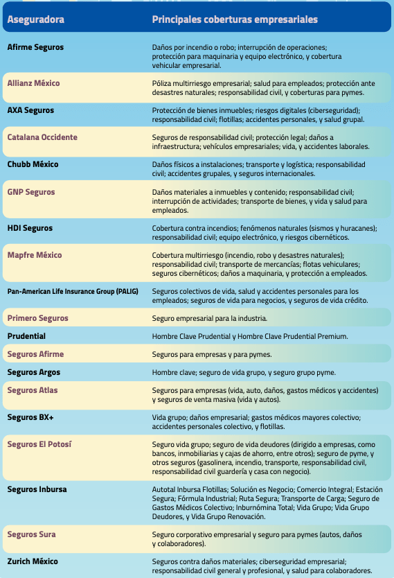 En el cuadro, presentamos las aseguradoras que ofrecen coberturas empresariales en México. La información detallada, así como las condiciones generales y exclusiones, están publicadas en los sitios oficiales de cada compañía.