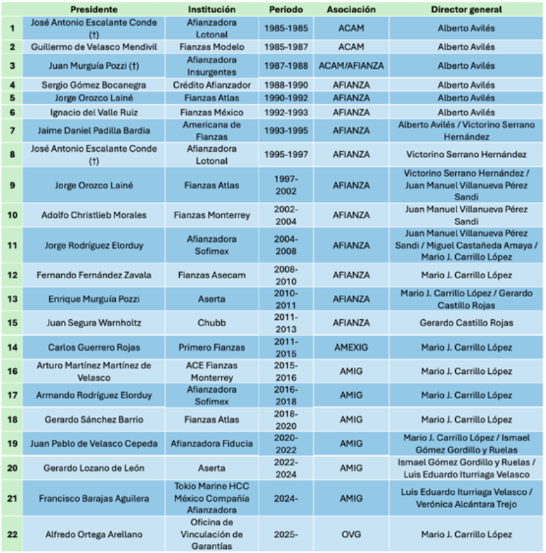 Posterior a ello y hasta la fecha han existido, por decirlo así, cinco membretes en tres razones sociales — Asociación de Compañías Afianzadoras de México, A. C.; Asociación Mexicana de Instituciones de Garantías, A. C., y Oficina de Vinculación de Garantías, A. C.—, que han representado a las instituciones del importantísimo sector afianzador mexicano. Aquí se presentan dichos membretes y se recuerda a quienes han presidido y dirigido a nuestras asociaciones.