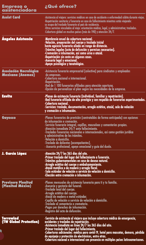 Dejar todo preparado aligera la carga emocional y financiera para quienes se quedan. Como los servicios funerarios y los seguros son otro aspecto fundamental de la prevención, que nos dan seguridad y representan una enorme ayuda para nuestros familiares en momentos emocionalmente difíciles, en el cuadro te presentamos algunas compañías de servicios funerarios y asistenciadoras que ofrecen diversas coberturas relacionadas con cuestiones funerarias. Consulta la información detallada de estas empresas en sus sitios web oficiales.