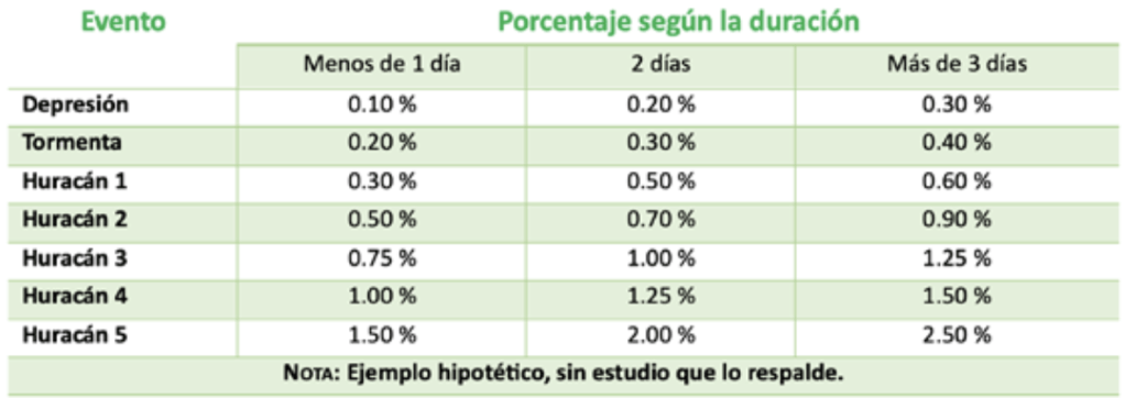 • Tener una tabla de deducibles cuyo porcentaje o monto dependa de la categoría del evento (ver tabla). La idea es que, cuando existan pequeños daños, los deducibles bajen y los asegurados reciban una indemnización.