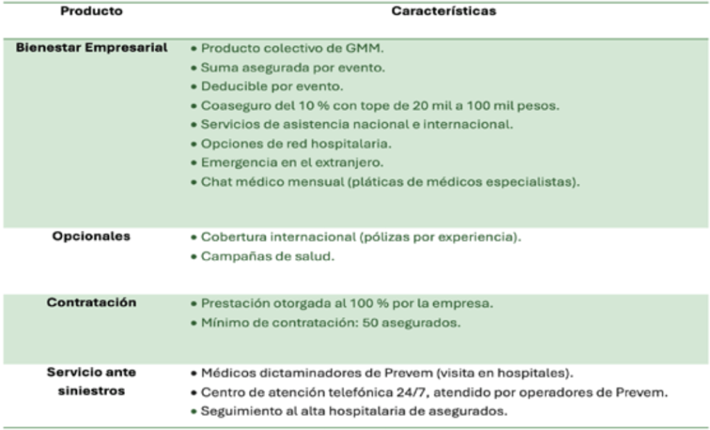 Las pólizas de GMM pueden proteger a todos los integrantes de la organización, los niveles medios y los administrativos de las empresas. A través de sus agentes, Prevem ofrece dos modelos de aseguramiento: el que usualmente se maneja en el mercado —suma asegurada, deducible y coaseguro por evento— y un producto por año póliza —suma asegurada, deducible y coaseguro con tope—, que se opera para pocas empresas. Estos esquemas se diseñan para grupos mayores a 50 personas.