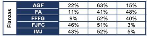 Enseguida de las iniciales se encuentran tres columnas con porcentajes, que se entienden en orden como los que reprueban, los que pasan y los que exentan. En este contexto, el dato que impresiona es el porcentaje de reprobados en los módulos de FJFC y de IMJ, pues podríamos decir que si tres amigos presentan el examen muy probablemente los tres reprueben o solo alguno pase y ninguno exente.