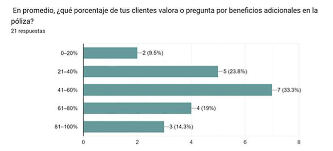 Para identificar qué tan relevantes resultan estos valores agregados durante el proceso de venta, cuáles generan mayor impacto en los clientes y cómo se puede innovar con ellos en el desarrollo de productos, encuestamos a 21 agentes de distintos ramos. Sus respuestas ayudan a entender cómo, en el sector asegurador, los beneficios adicionales fortalecen la relación con el cliente, consolidan la propuesta de valor de una póliza e influyen en la suscripción (ver gráfica).